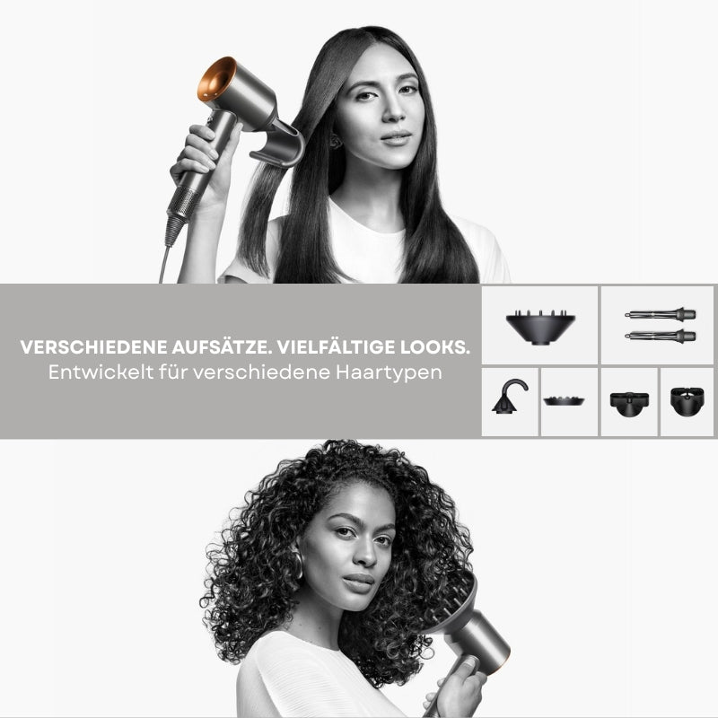 Vielseitige Anwendungsmöglichkeiten: Acht verschiedene Aufsätze für verschiedene Styling-Techniken wie Glätten, Locken und Wellen.